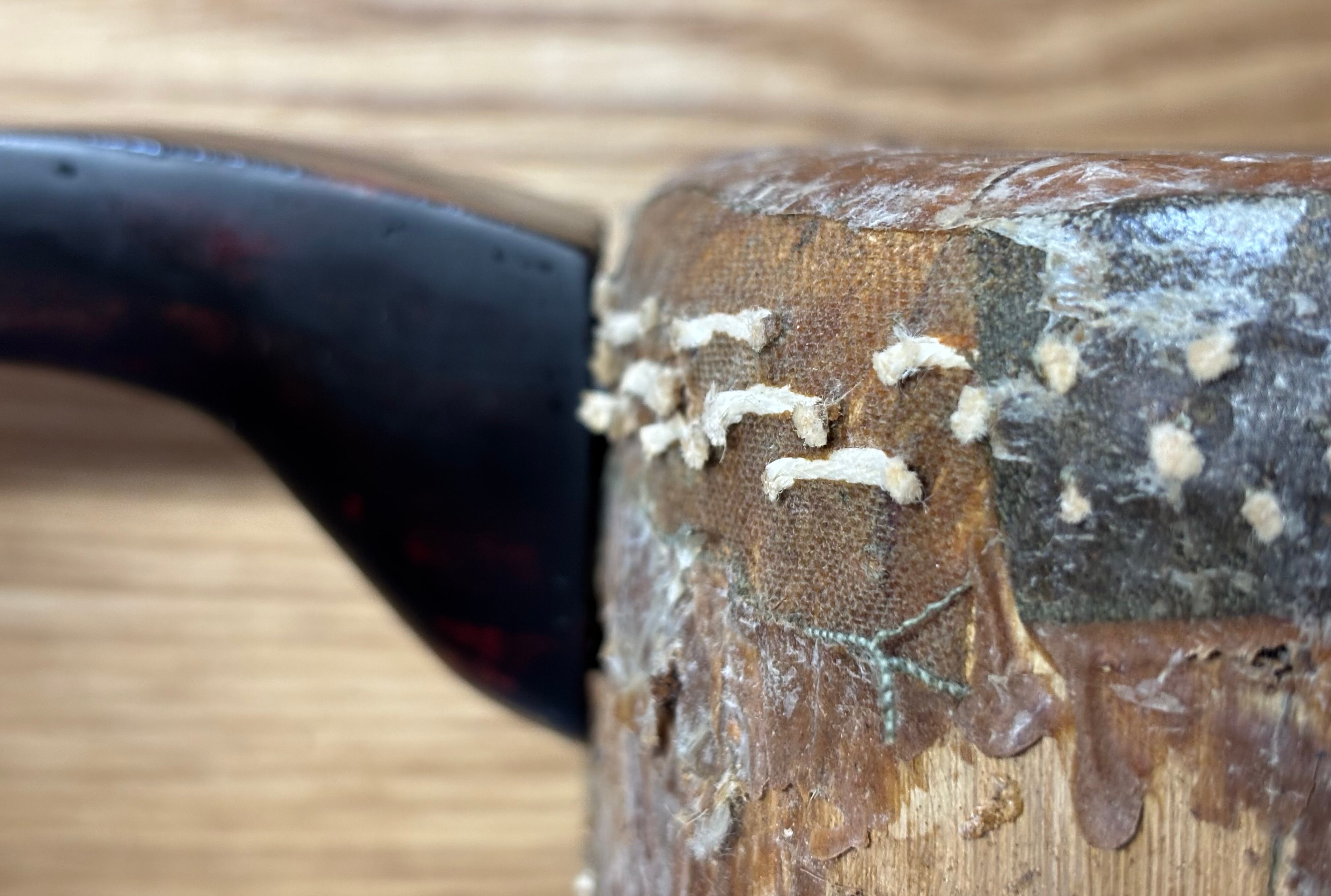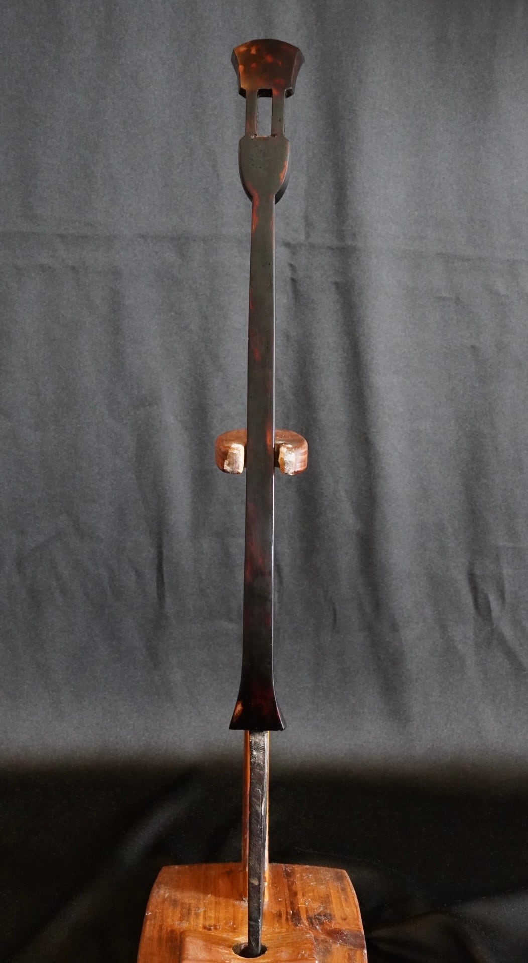 王府時代のどの辺りかは不明ですが、かなり古い年代の物と推測されます。野長一尺五寸六分五輪、芯長が短く、附属の胴以外では装着が困難です。その為必ず元の胴をご使用下さい(※現代のチーガでは芯先の猿尾が完全に出ません)。胴を見てみると分かりますが、棹の芯の造りが芯上げに設計され作られており、この棹に合わせて胴が作られていることが穴の位置からも分かります。また、芯長に合わせた胴の外径であります。オリジナルの胴が附属していることは大変珍しく貴重であります。また、胴の外側には、僅かに麻布が付着しているのが確認できます。このことからも、当時の皮張り時に皮の破れ補強のために麻布が用いられた可能性が高いことを意味しています。棹の状態は若干捻りが見られます。トゥーイは深め。糸蔵内部の金箔も非常に古く、棹と胴においても現状保存することが最もではないかと考えております。勿論この胴に皮を張ることは可能であり、楽器として組み上げることもできます。然しながら棹+胴という今の現実で保存することに価値を見ております。骨董三線や琉球王朝時代の作品に関心のある方限定でご購入をお願いいたします。何卒宜しくお願い申し上げます。