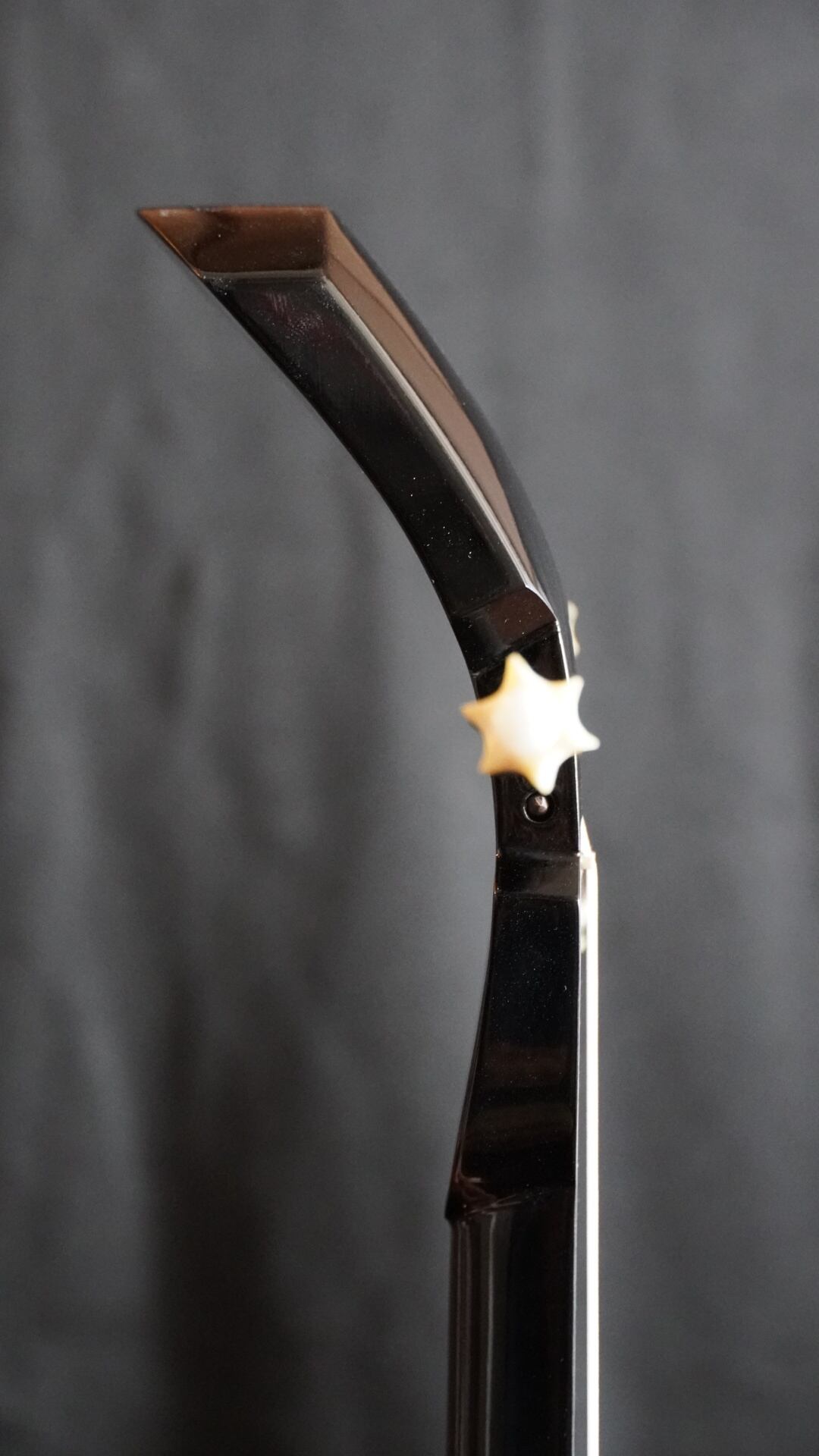 伝説的三線名工、巨匠又吉康美作の昭和後期の真壁型三線。昭和後期、駆け出しの時代の数少ない作であり、念入りに歳月をかけて制作されていた当時の入魂の一丁。後に現代型真壁と名付けられた正統派タイプのこの造形は他三線職人や愛弦家に多大な影響を世に与えました。あらゆる角度からその洗礼された造形美をお楽しみください。当時の黒塗りは一部塗り剥がれ(虹の輪赤丸印部分)や打ち傷などがありますことをご理解ください。芯に販売店のシール跡。ウズラミ模様入。棹には捻りなどなく正常です。爪裏鑿彫もろ取り。正面から見て右側鳩胸の数ミリ、材が足りない部分を継いでいるのが確認できますが、非常に丁寧に調整されているため一見すると分からないほどです。古いヴィンテージのカラクイと龍刺繍胴巻きが装着されています。両面本皮張り、八分張り。音色よく立ち上がりのある響き。新品ハードケースが付属します。探しても中々お目にかかれない初期の作。この機会にぜひご検討くださいますよう宜しくお願い申し上げます。送料込みゆうパック発送でお届けいたします。