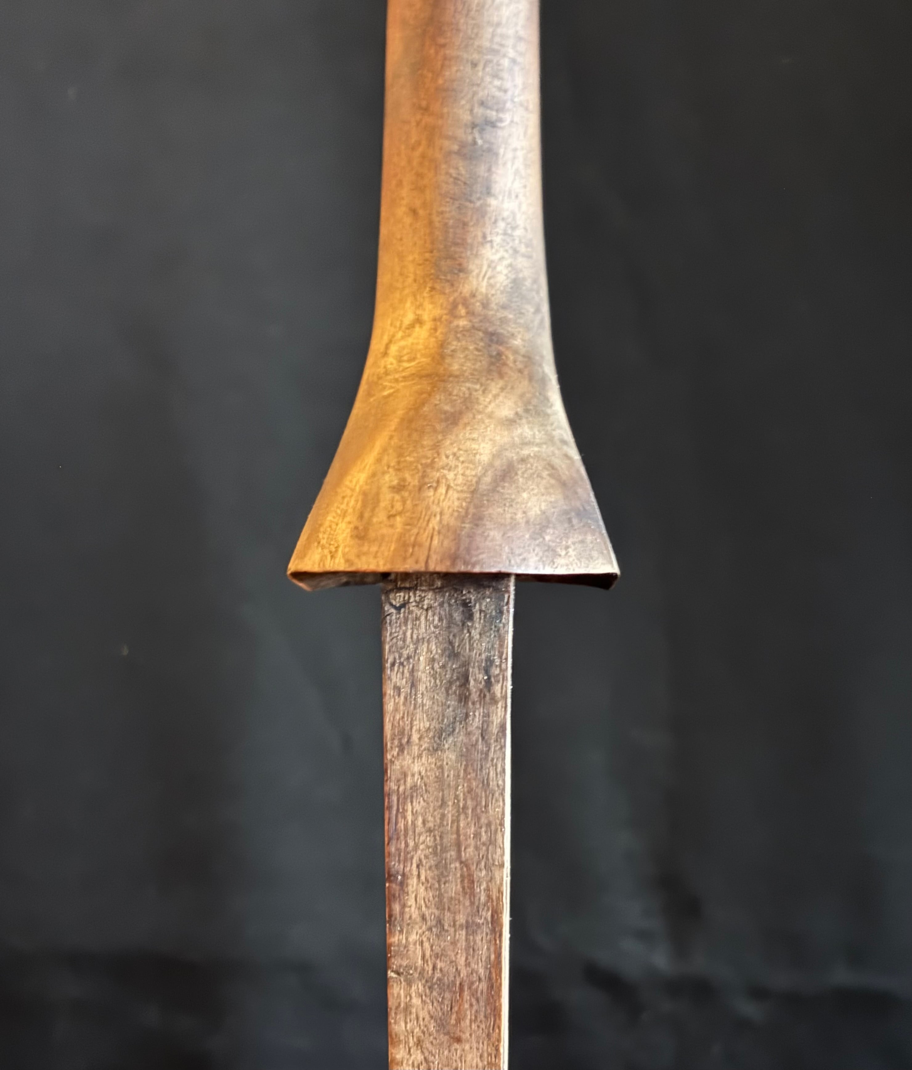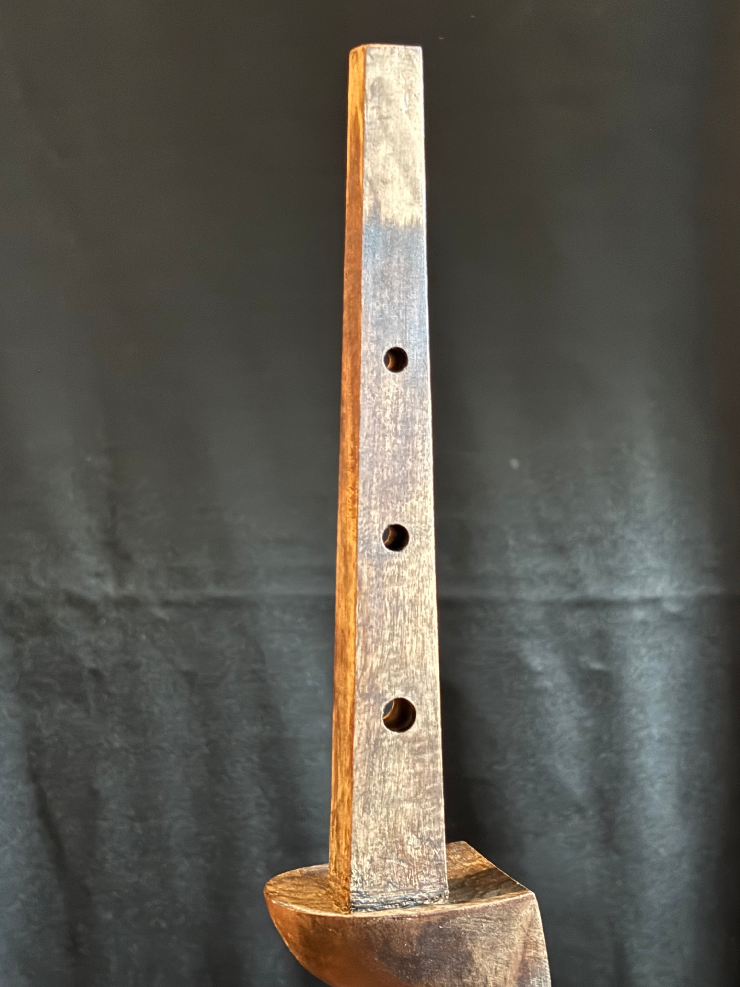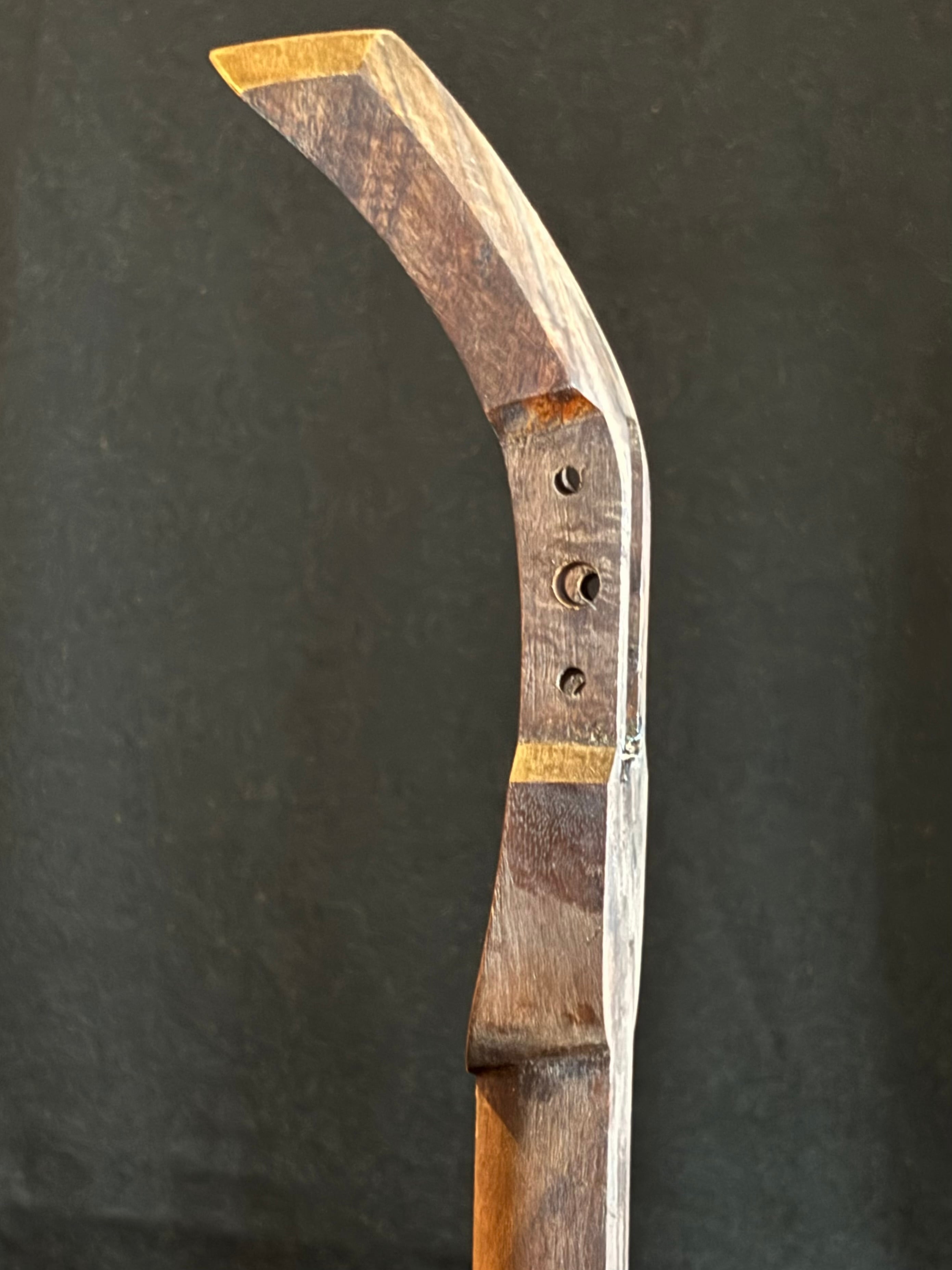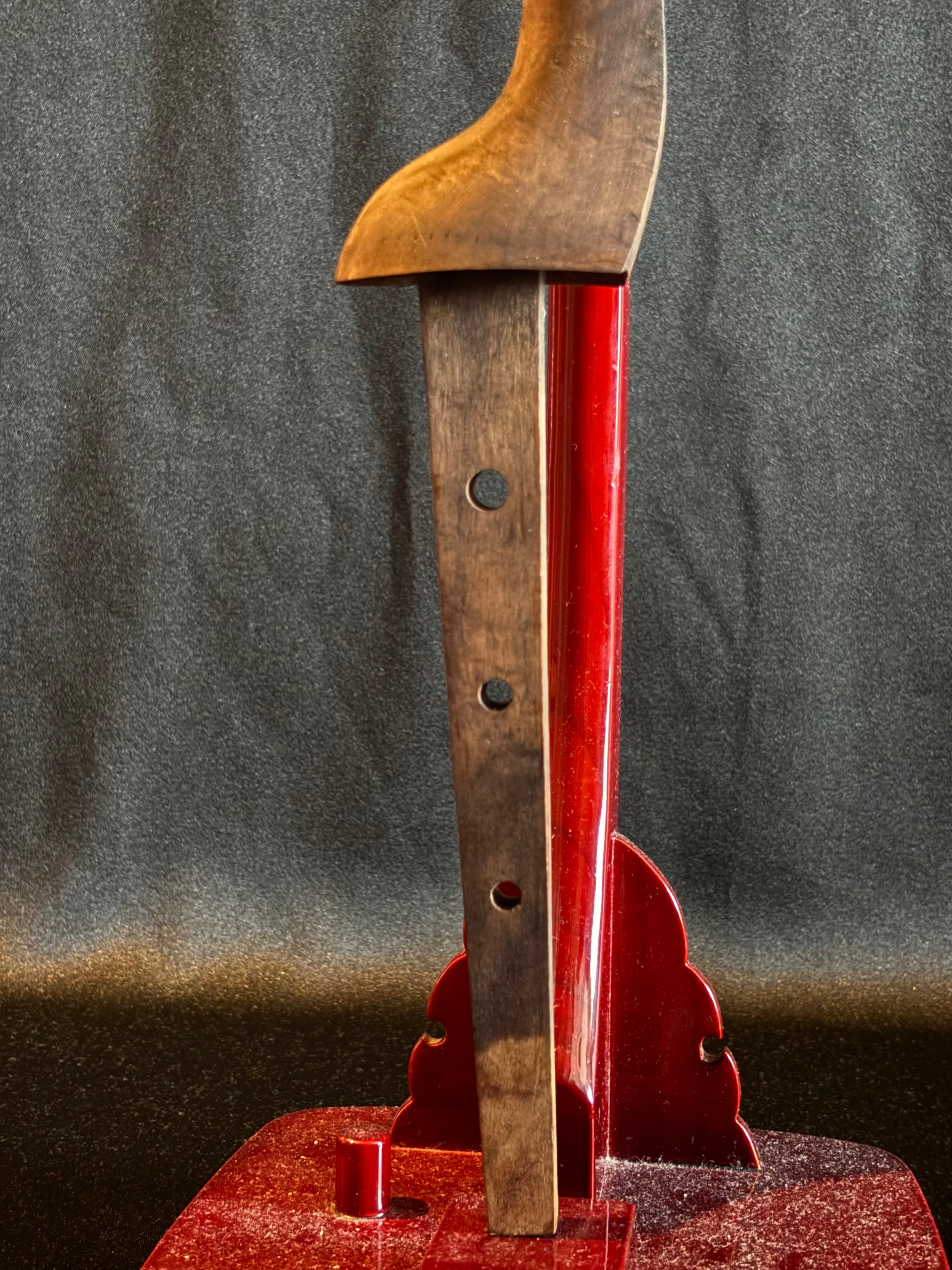 大宜味村の古い大木の相思樹ソウシジュで製作されたと伝わる江戸與那城型棹。非常に立派な造り。銘苅型与那城の造りに非常に近いが、作者は不明。銘苅作に模して作られたものか? 年代は不明だが、平成時期の作と推測される。野長一尺五寸四分五厘。やや太棹。芯穴三つ。塗りなし。棹の状態良好。ポイントとして、この相思樹材で製作された棹に対してカラクイを選ぶ際は、材質や種類や年代様々に相性を選ぶ必要があるでしょう。一般市販の黒木カラクイでも合う場合もありますが、実際に実物を持参しお店を回り、しっかり止まるものを探すことをおすすめします。意外なものと相性が合うこともありますので、そのパーツ選びにかける手間も楽しいです。じっくり完成されてみてください。