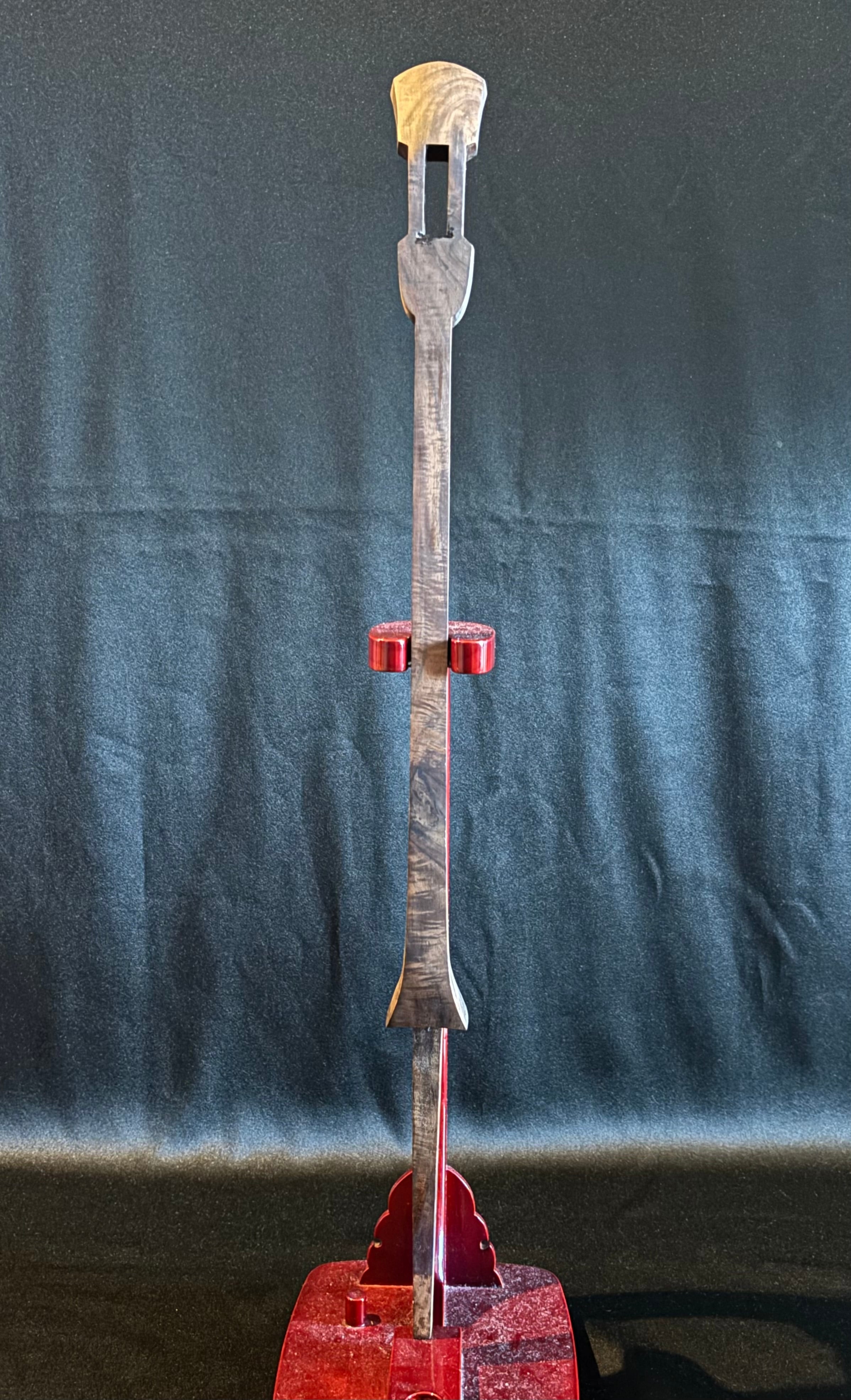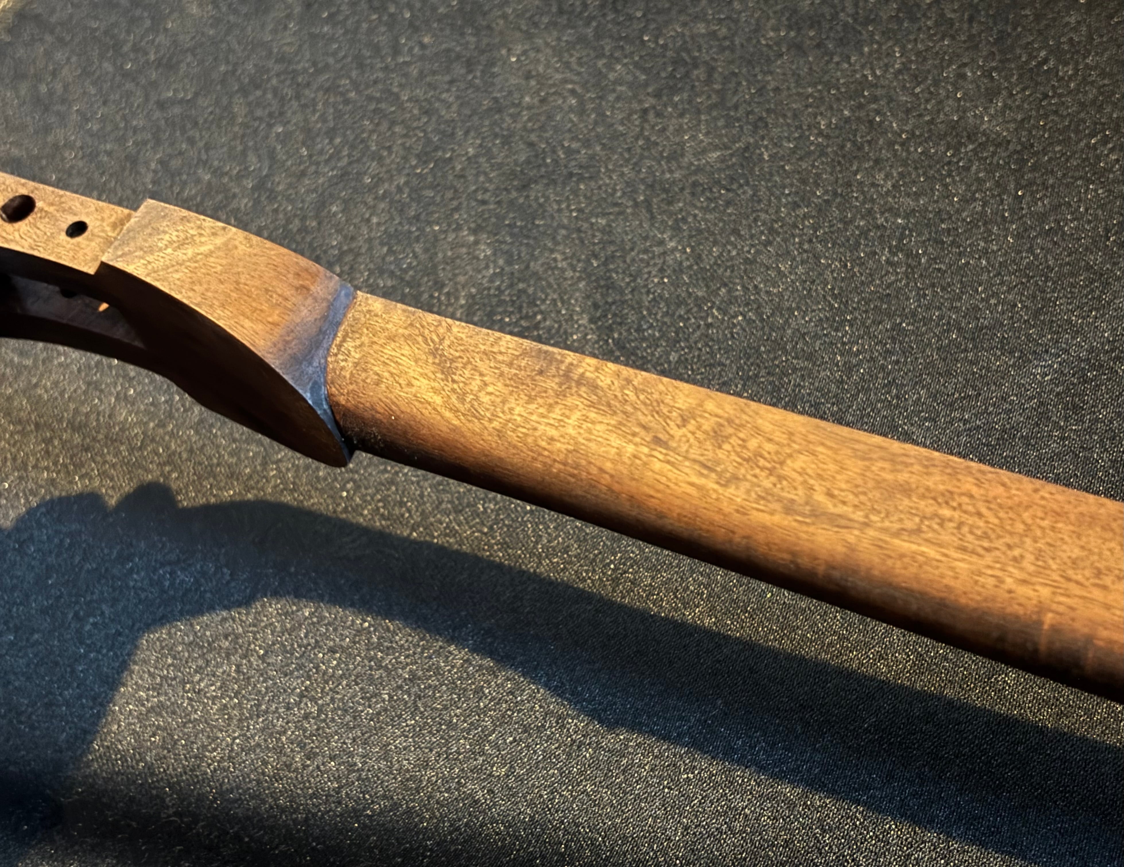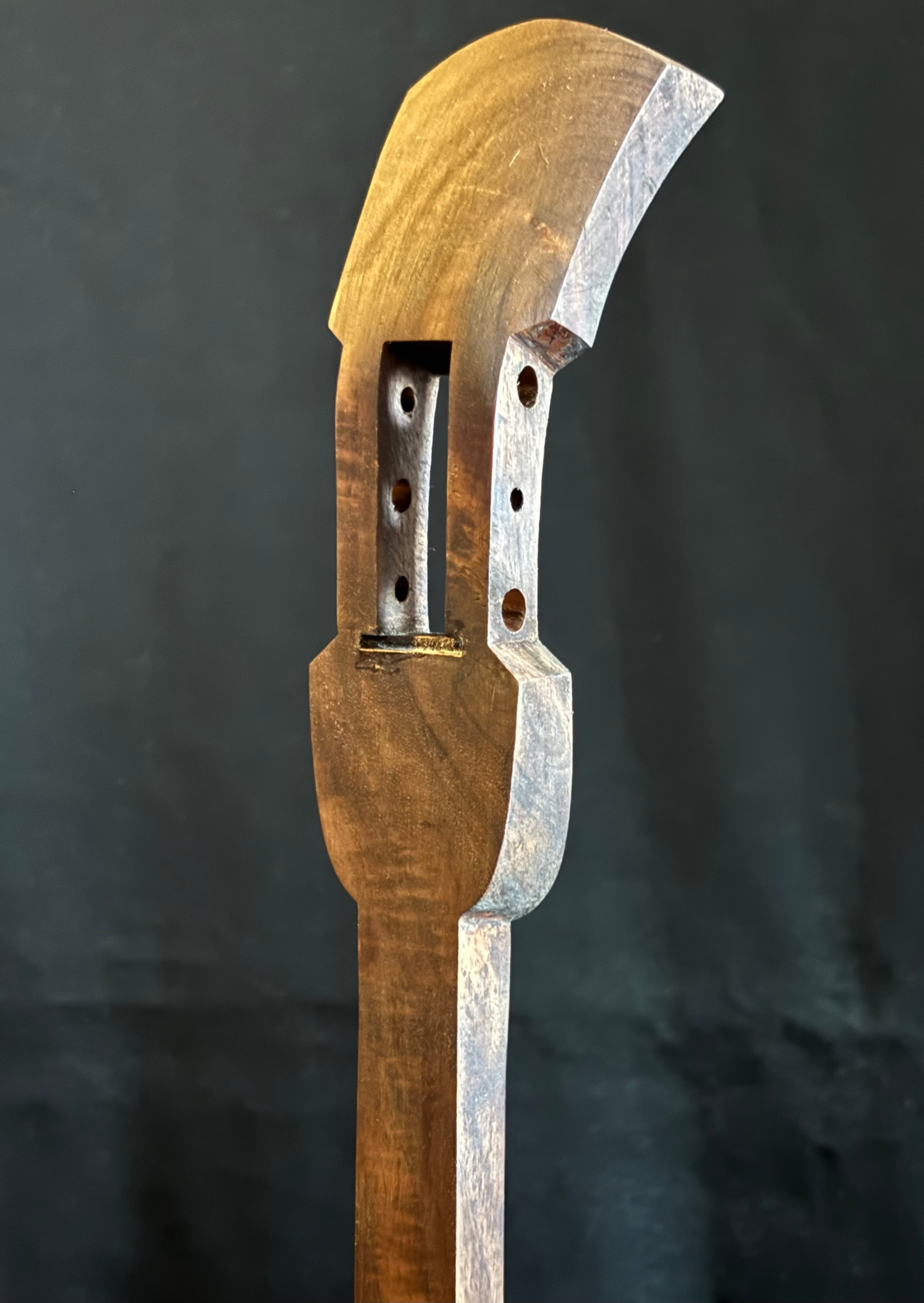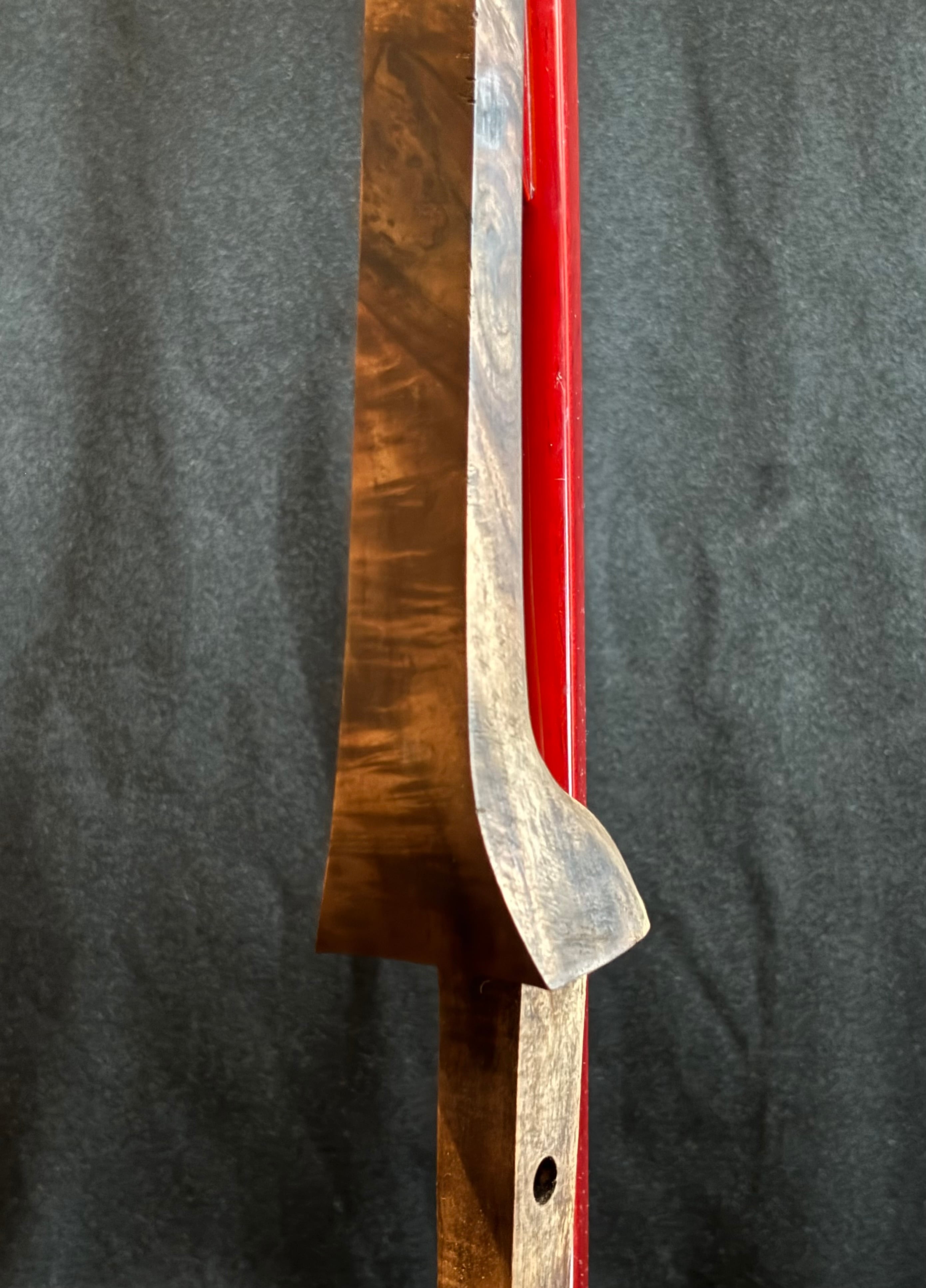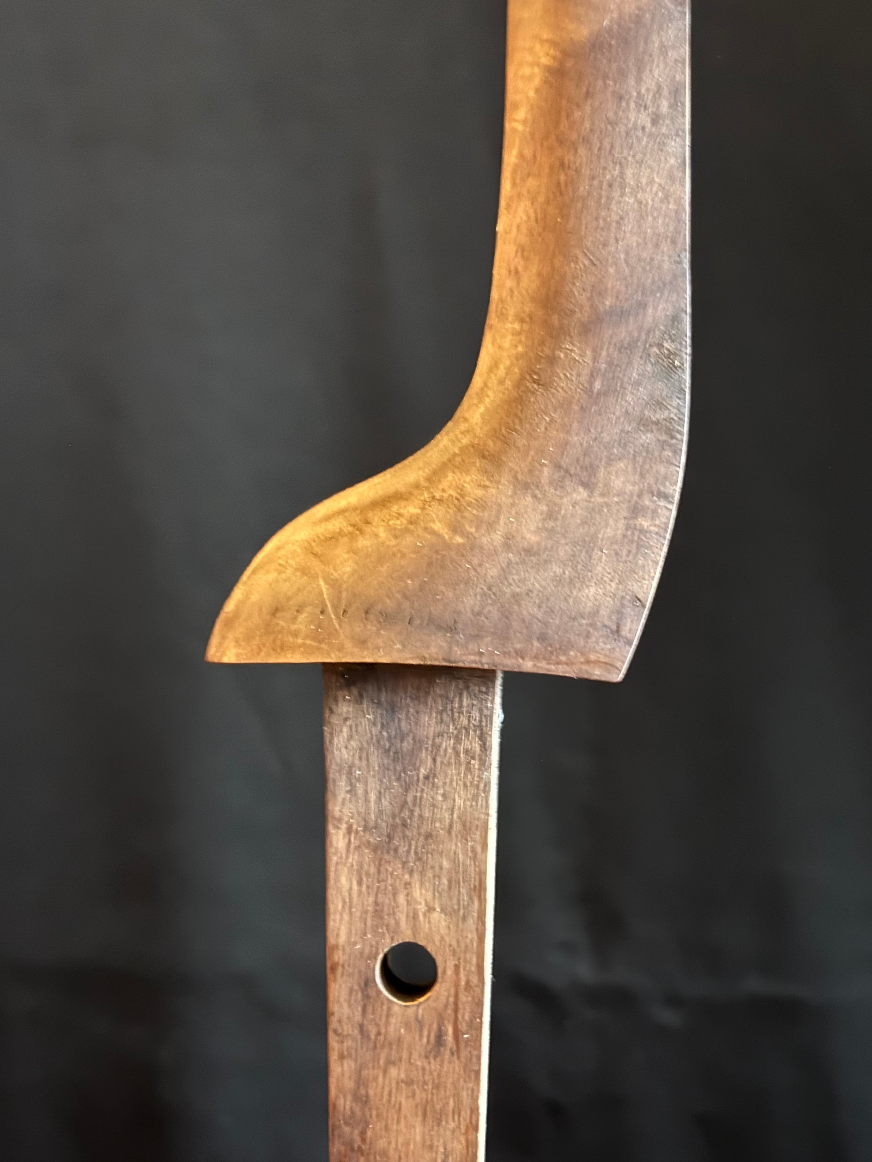 大宜味村の古い大木の相思樹ソウシジュで製作されたと伝わる江戸與那城型棹。非常に立派な造り。銘苅型与那城の造りに非常に近いが、作者は不明。銘苅作に模して作られたものか? 年代は不明だが、平成時期の作と推測される。野長一尺五寸四分五厘。やや太棹。芯穴三つ。塗りなし。棹の状態良好。ポイントとして、この相思樹材で製作された棹に対してカラクイを選ぶ際は、材質や種類や年代様々に相性を選ぶ必要があるでしょう。一般市販の黒木カラクイでも合う場合もありますが、実際に実物を持参しお店を回り、しっかり止まるものを探すことをおすすめします。意外なものと相性が合うこともありますので、そのパーツ選びにかける手間も楽しいです。じっくり完成されてみてください。