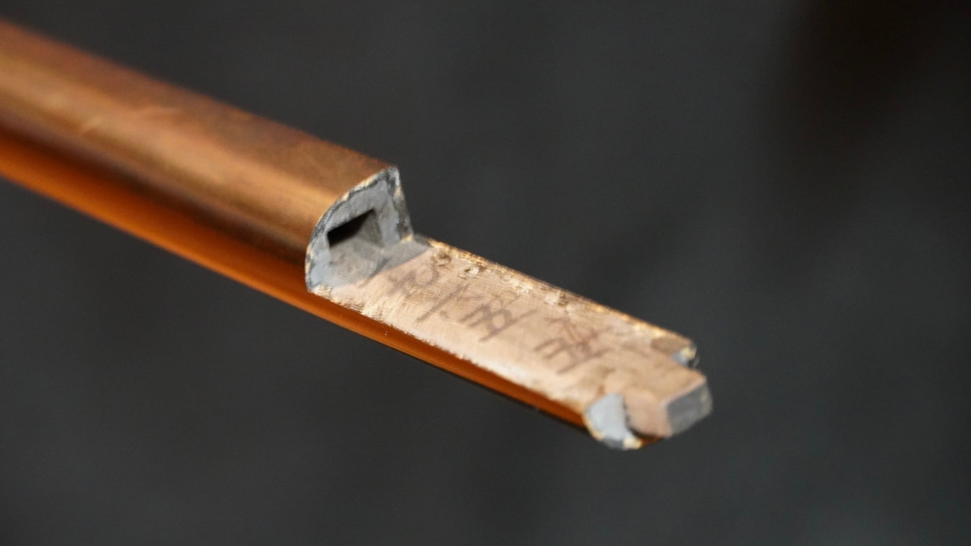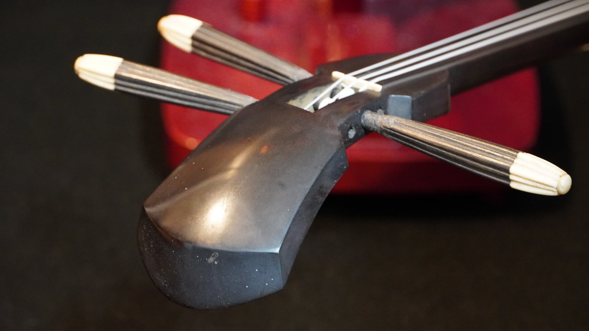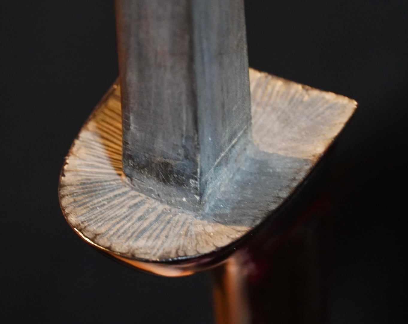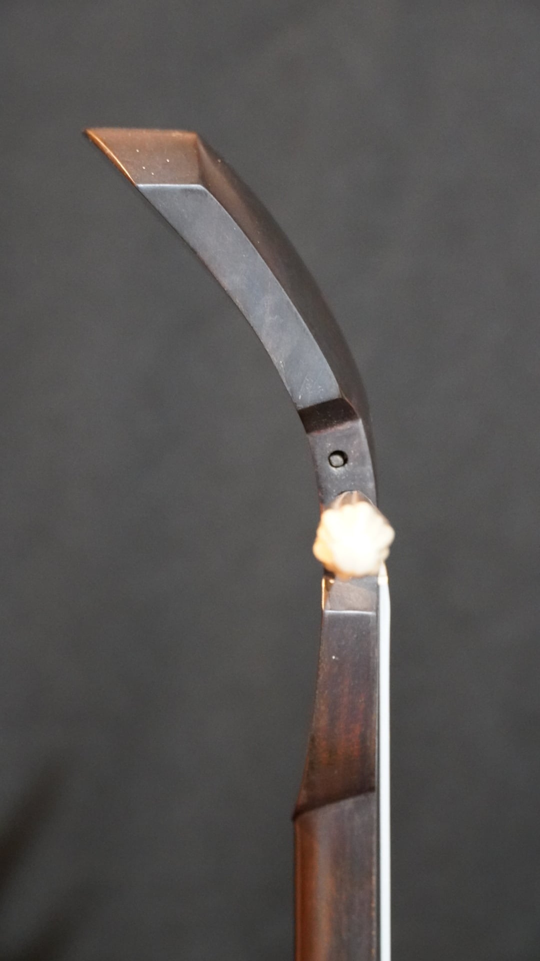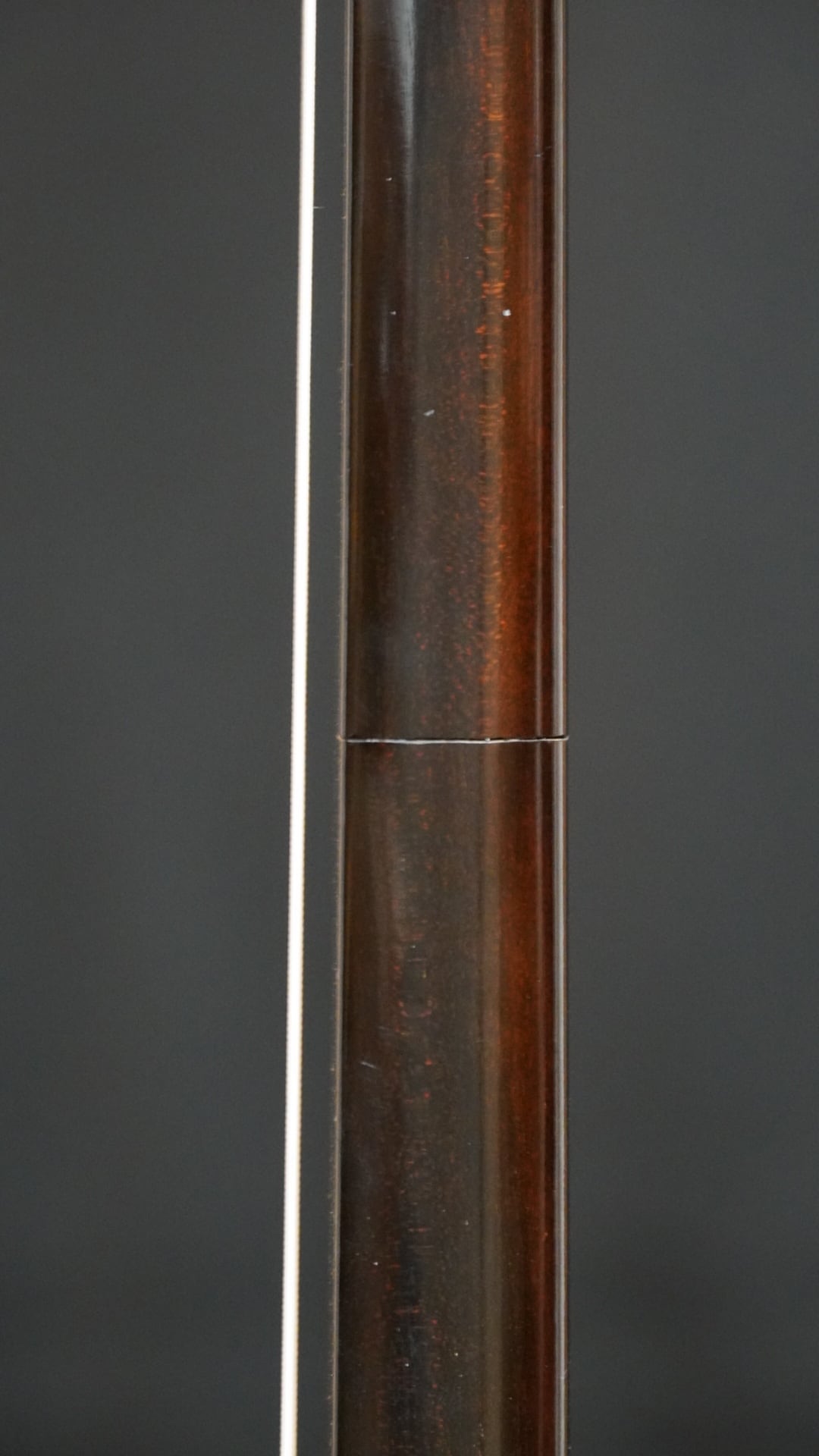少し前になりますが、修理依頼で持ち込まれた御三線です。修理後暫くは店頭に飾られていましたが、ご縁あってこちらで預かる運びとなりました。ご紹介できる事を大変嬉しく思っております。四つ割黒木使用。野面中央部から二つに二分化することが可能な分解式三線。制作には2年以上を要した。この三線は昭和後期頃に、ある三線店の依頼の下請業務として、それでいて誠に丹精込めて製作し納められた作品です。何故ここまで分かるのかと言うと、直接又吉さんから伺い、その当時の作品を見せていただいたことがあったので、この作品を見て直ぐにそれと分かることが出来ました。非常にレアな作品です。良くこの年代まで保管できたものだなと感心いたしております。本作品は全体的に依頼主の三線屋の好みに合わせて形作られていますが、ある一つの箇所に又吉さんの拘りと好みが取り入れられています。それが鳩胸です。この鳩胸は盛島開鐘の造形に寄せて打ち込まれています。塗りは今は亡き湖城氏による透明漆の薄塗り仕上げ。全体のきめ細かな造形は勿論ですが、野面中央の分解部分の精妙な造りに我々はただただ驚かされるものです。分解式ということで、後々捻ってしまってはジョイント部の噛み合わせが困難になってしまうため、特に時間と技術と、良質な材が必要不可欠です。その為シラタがほぼ入っていない堅木の四つ割黒木(フィリピン産と思われる)のウジラミが使用されています。制作されてから役四〇年ほど経過していますが、捻りなし正常。分解も狂いなく動作するのですから驚くべきことです。ジョイント部に記されたマジックの数字は、雄と雌、どちらか間違いがないようメモされた数字になります。胴巻もわざわざ一枚だったものを分解して、王朝時代の片方ずつの仕様にしているのも拘りがあってユニークです。胴も古いものですが、蛇皮は念のため裏側から補強しておきました。鳴りも優しく中音域で心地よさがあります。年代物のため古傷など使用感が見られ、塗りも所々曇りがかった箇所もありますが、これもまた歴史の一つです。現状の雰囲気や作風は塗り替えしてしまうと失われてしまうため、維持されることを強くお勧めいたします。なによりも、現状で問題なく演奏を楽しむことができるのですから。セミハードケースが付属いたします。拘りのレア三線をお探しの方必見!是非ご検討下さい。どうぞ宜しくお願いいたします。