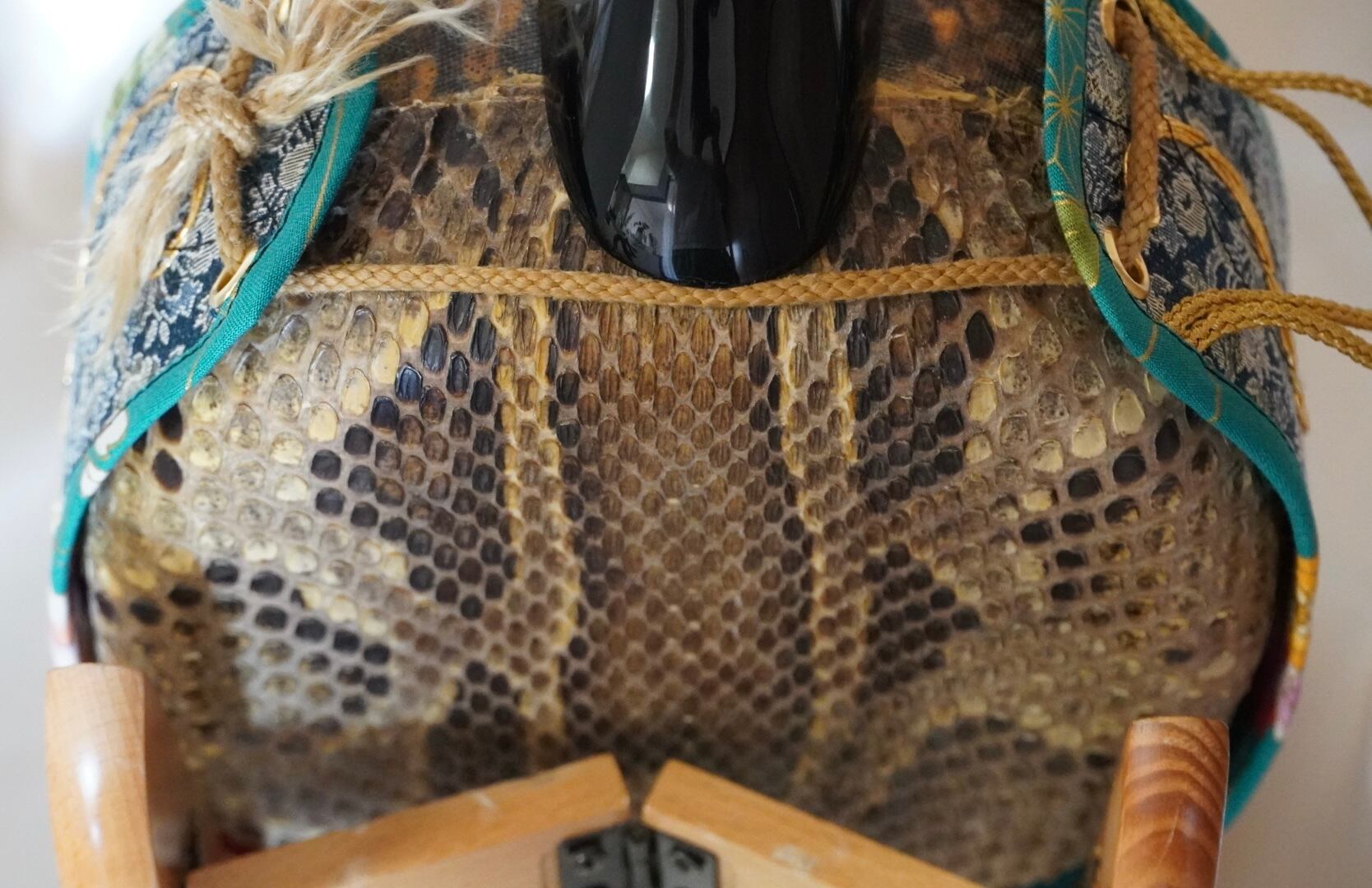 同じくこの材料で造られた古い三線が今回ご紹介します真壁型三線になります。当初は塗りが大変古いため、塗り剥をし、黒塗り仕上げにしました。棹材の欠けや継ぎなどはありません。チーガも古いチャー木(イヌマキ)が用いられた手作りもの。外側から内部を見ても直ぐにそれと分かりますが、調整の際にナイフを立てたところ、削り取る感触からも年代物であることが確認できます。表面昭和期人工皮張、裏面本皮張。音色はまるで嘉手苅林昌サウンド。歯切れ良い軽快な音です。棹の状態も正常。カラクイはあえて交換せず当時の状態そのままで装着しています。このままで最高です。全体的に調整済みですので、他に手を入れる必要もございません。胴巻は昔三線に巻かれていたデザインを復刻制作したものを装着しています。